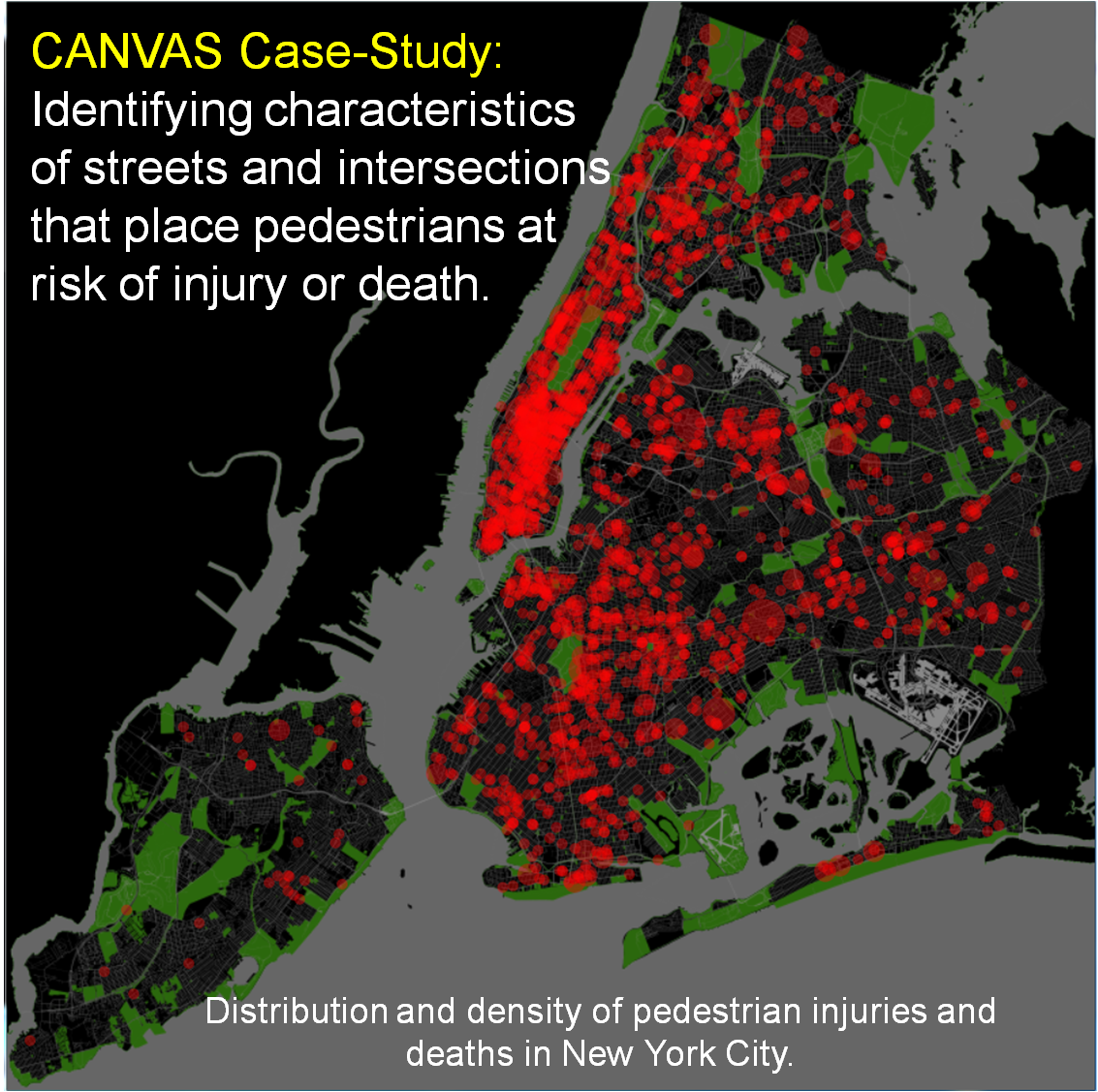 Our submission was motivated by a proposed research case-study to use CANVAS to identify characteristics of intersections that put pedestrians at risk of injury or death. Approximately 5,000 pedestrians in the US are killed by motor vehicles ever year and many fold more are injured.