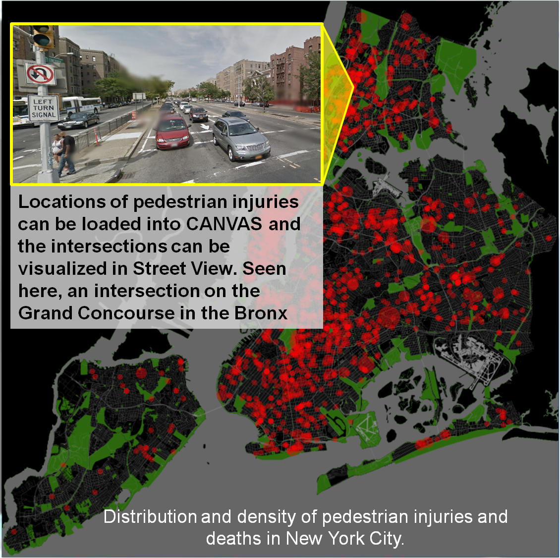 Data on the locations of pedestrian injuries & deaths can be loaded into CANVAS and the intersections can be systematically viewed in Street View.