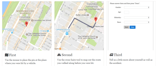 I-PIM has a Google maps based tool that allows a user to place a pin on the intersection or street where they were hit and to then map the route they walked prior to getting hit. I-PIM then asks some questions about the user, such as age and gender and then asks some questions about the collision, such as the type of vehicle that hit the person and whether they received medical care at the scene or had to go to the hospital.
