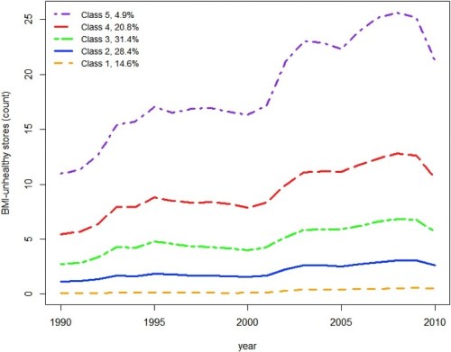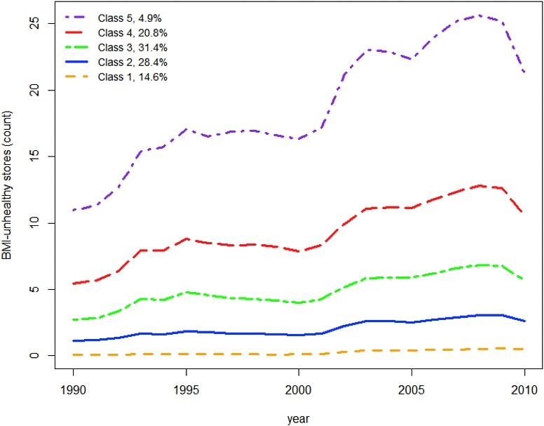 Trajectories of changes were analyzed using Latent Class Growth Analysis in order to identify neighborhoods with similar patterns of changes. The analyses identified five latent classes, which can be thought of as typologies of neighborhood trajectories for the availability of BMI-unhealthy food retail. The figure below shows the count of BMI-unhealthy retail outlets per year for each of the five latent classes.