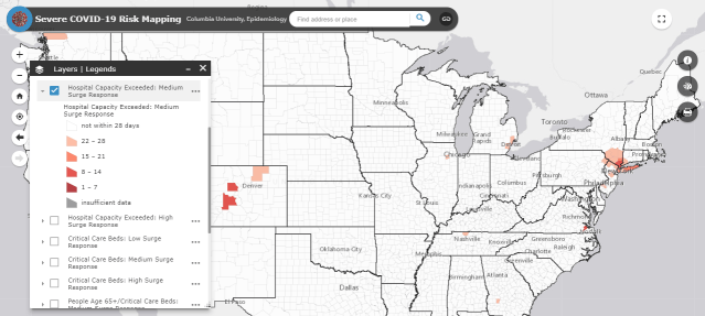 Our online mapping tool has been updated with new data showing counties that are at high risk of experiencing patient volumes that exceed their hospital capacity over the next 6 weeks. The maps show at risk counties for three different levels of social distancing and two levels of intensity of surge responses by hospitals. The estimates use Jeffrey Shaman and colleague’s models of disease spread and the estimates posted previously of how many critical care hospital beds can be made available under various assumptions of hospital responses to patient surges. A full description of the methods can be found |here|