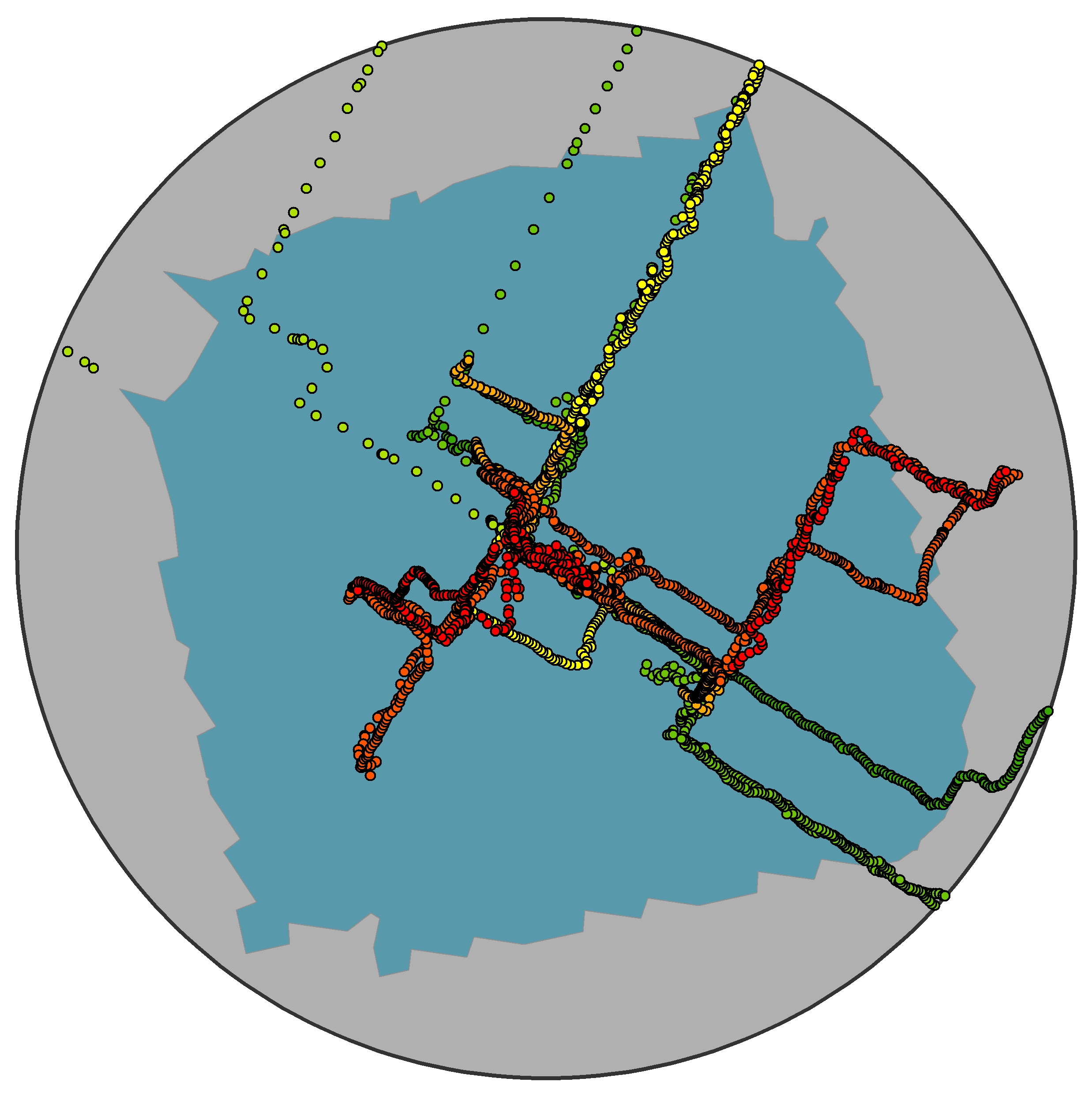 The figure below shows GPS data collected from within 1 Km of a home (1 Km radial buffer), with each day worth of GPS colored coded and the 1 Km street network buffer shown in blue.