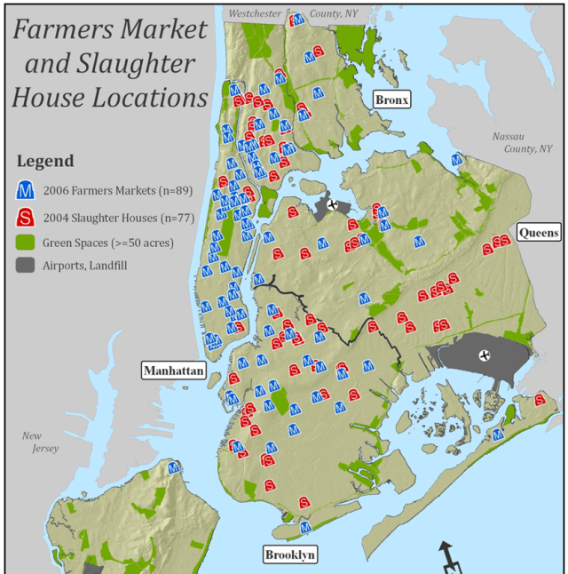 The map above shows data on farmers markets and life animal markets we used in our study of food preferences and attitudes among Hispanic women in NYC.  Results from our qualitative interview study showed that foreign-born, Hispanic mothers of children in Head Start distrusted and were dissatisfied with food purchased in supermarkets [4].  They felt that produce and meats in supermarkets was not fresh, was likely to be contaminated with chemicals and had poor flavor.  Their descriptions of what constituted healthy food aligned with the organic farming, slow food and locavore movements, food systems they reported experiencing in their countries of origin.  These women reported that they preferred to shop at farmers markets and live small animal markets in NYC.  Our analyses of food frequency questionnaire data from a larger group of Hispanic women showed that having a farmers market with 0.5 Km of the home was associated with higher consumption of fruits and vegetables and that having a farmers market or slaughter house within this distance of home was associated with higher meat consumption [4].  Consumption of fruit and vegetables and meat was not associated with the presence of a supermarket in their neighborhoods.